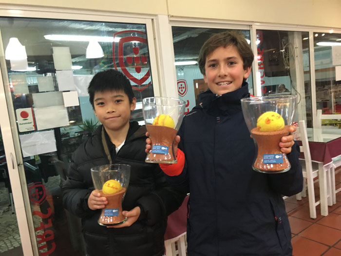 Duarte Trindade (à direita) vencedor a singulares e pares masculinos e Gabriel Tan (à esquerda) vencedor a pares masculinos do Torneio do Carcavelos Ténis Sub-12.