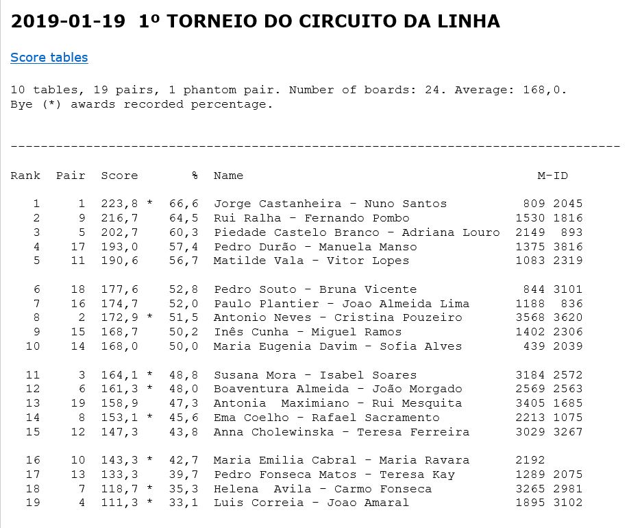 Numa organização do CNG, realizou-se, no passado dia 19 de Janeiro de 2019, o 1º Torneio da Linha de 2019. A prova foi realizada nas instalações do IASFA em Oeiras e foi ganha pelo par Jorge Castanheira e Nuno Santos. Em 2º lugar ficou o par Rui Ralha e Fernando Pombo e, em 3º lugar, ficou o par Piedade Castelo Branco e Adriana Louro. Na prova participaram 19 pares tendo a direção do torneio ficado a cargo de Carlos Ferreira. Previamente à realização do torneio procedeu-se à entrega dos prémios globais do Circuito dos Torneios da Linha de 2018. O próximo Torneio da Linha será realizado no dia 23 de Fevereiro também nas instalações do IASFA.