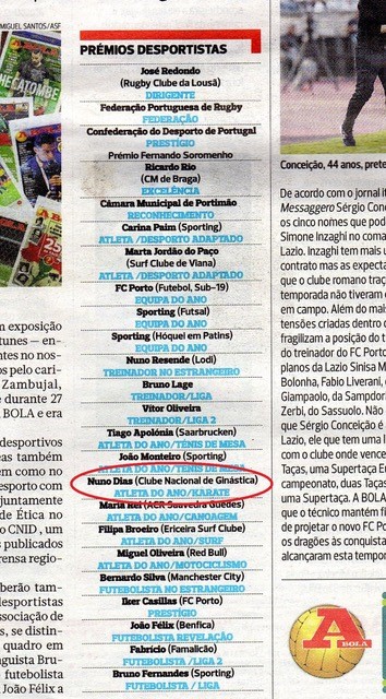 O atleta do CNG Nuno Dias foi distinguido pela CNID (Associação de jornalistas de Desporto) como ATLETA DO ANO, nos seus prémios anuais. Esta distinção vem premiar todo o trabalho e esforço do Nuno, durante todos estes anos. Um atleta de topo na modalidade, que em 2018 voltou a ser campeão do mundo em Karaté Shukokai.