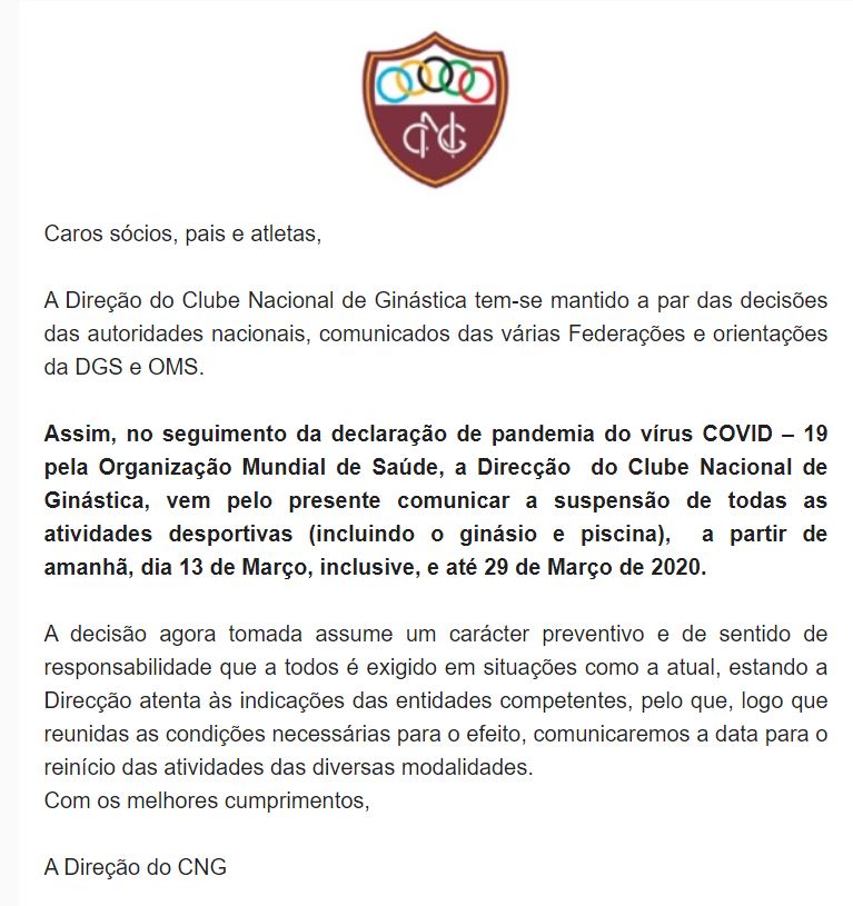 Neste momento não nos é possível indicar uma data para a reabertura do Clube Nacional de Ginástica, o que se fará quando existirem as condições para o efeito.