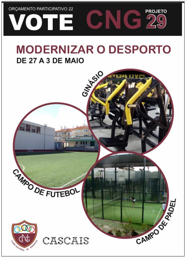 O Clube Nacional de Ginástica concorre ao Orçamento Participativo´22 de Cascais com a intenção de modernizar o desporto com a substituição de Máquinas para o Ginásio, substituição do piso do Campo de Futebol e construção de Campos de Padel .