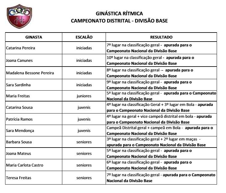 Com a participação de 27 ginastas, em escalões das Benjamins às seniores, o CNG obteve o apuramento de 12 ginastas para o campeonato Nacional da Divisão Base.
