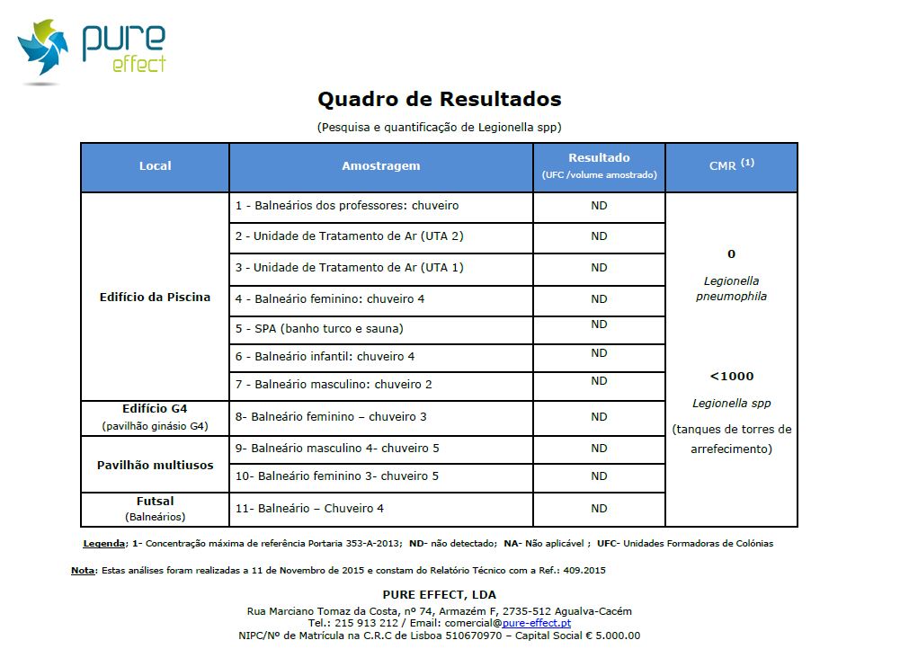 Conforme acontece todos os anos, foram efectuadas nas instações do Clube Nacional de Ginástica análises para pesquisa e quantificação de Legionella. Mais uma vez ficou verificado que não há registo de Legionella pneumophila nas nossas instalações.