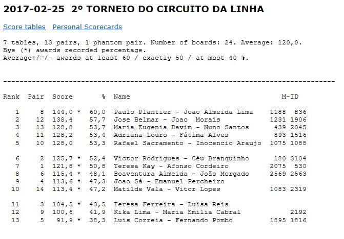 Numa organização do CNG realizou-se no passado dia 25 de Fevereiro de 2017 o II Torneio da Linha de 2017. A prova foi realizada nas instalações do IASFA em Oeiras e foi ganha pelo par Paulo Plantier e João Almeida Lima. Em 2º lugar ficou o par José Belmar e João Morais, e, em 3º lugar, ficou o par Maria Eugénia Davim e Nuno Santos. Na prova participaram 13 pares tendo a direcção do torneio ficado a cargo de Carlos Ferreira. Chamamos a atenção para o adiamento da data de realização do III Torneio da Linha de 2017 que passou de 11 de Março de 2017 para 1 de Abril de 2017.