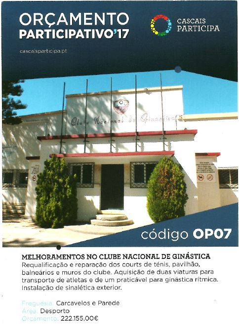 O Clube Nacional de Ginástica concorreu este ano ao Orçamento Participativo da Câmara Municipal de Cascais, para melhorar alguns dos seus espaços (pavilhão, campos de ténis, muros e balneários) e adquirir um praticável e duas carrinhas.