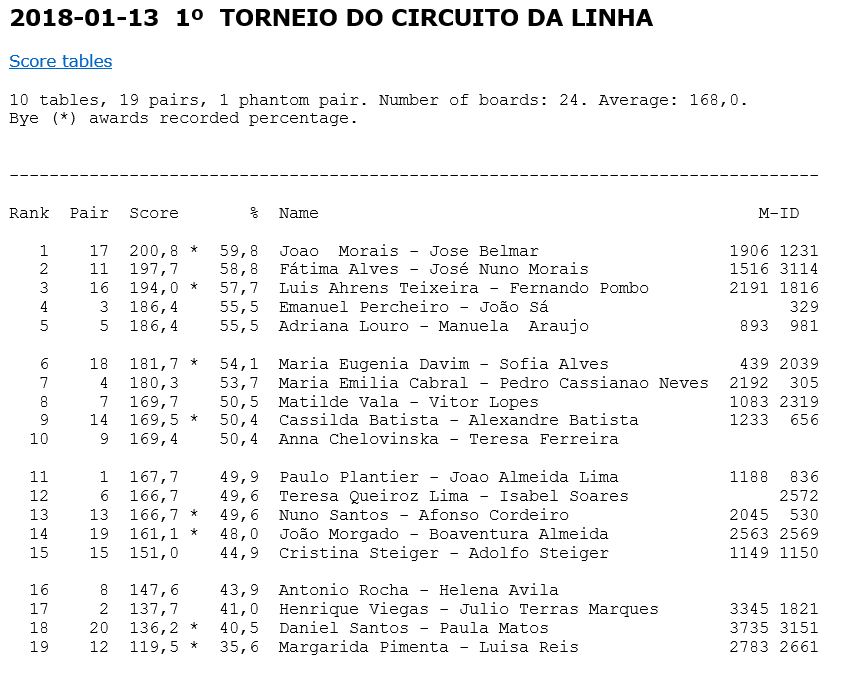 Numa organização do CNG, realizou-se, no passado dia 13 de Janeiro de 2018, o 1º Torneio da Linha de 2018. A prova foi realizada nas instalações do IASFA em Oeiras e foi ganha pelo par José Belmar e João Morais. Em 2º lugar ficou o par Fátima Alves e José Nuno Moraes e, em 3º lugar, ficou o par Luís Ahrens Teixeira e Fernando Pombo. Na prova participaram 19 pares tendo a direção do torneio ficado a cargo de Carlos Ferreira.