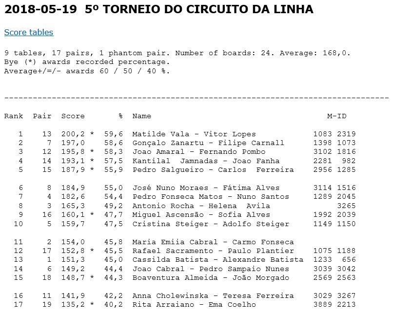 Matilde Vala e Vítor Lopes vencem o 5º Torneio da Linha 2018 organizado pela secção de bridge do CNG
